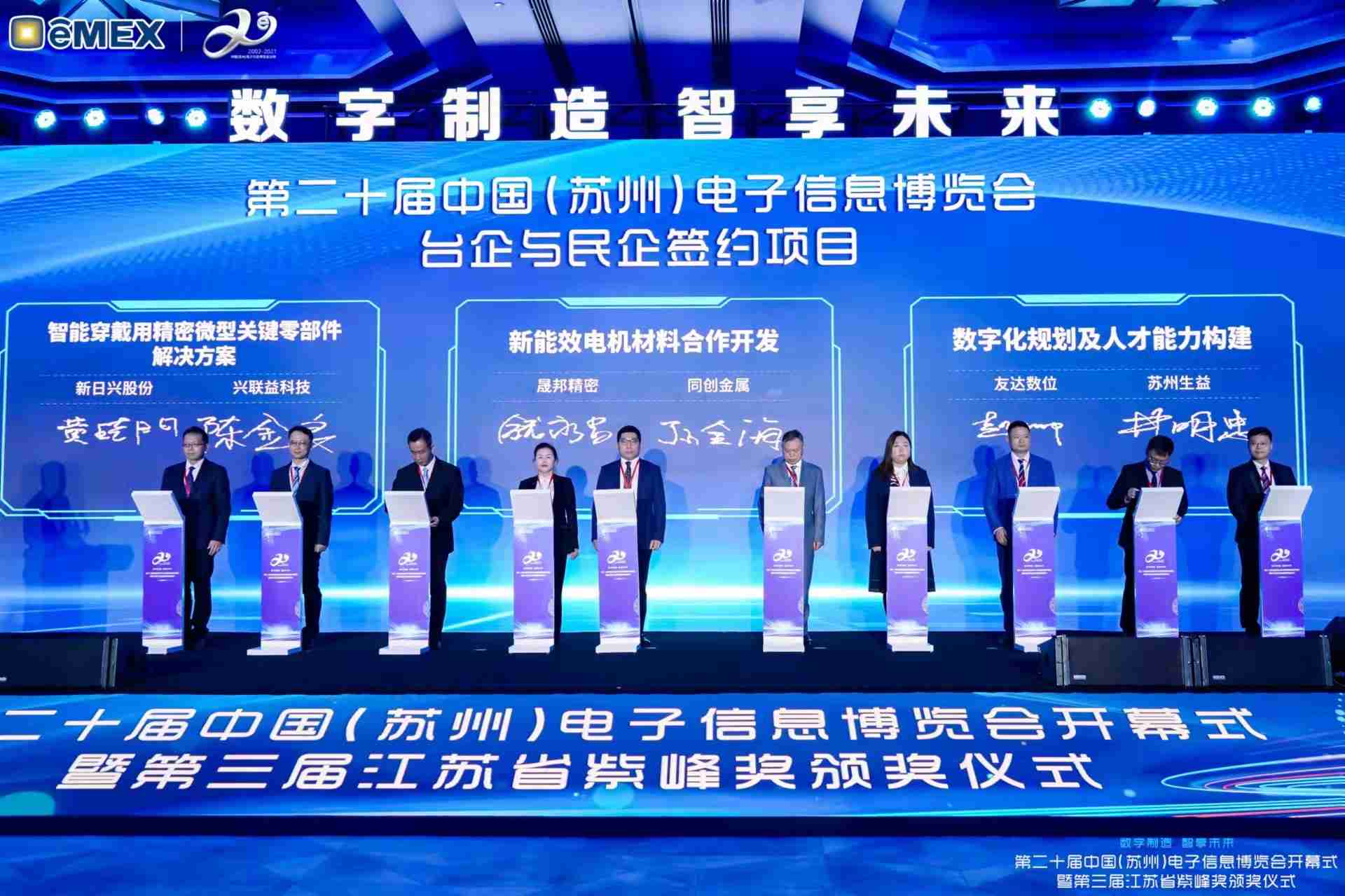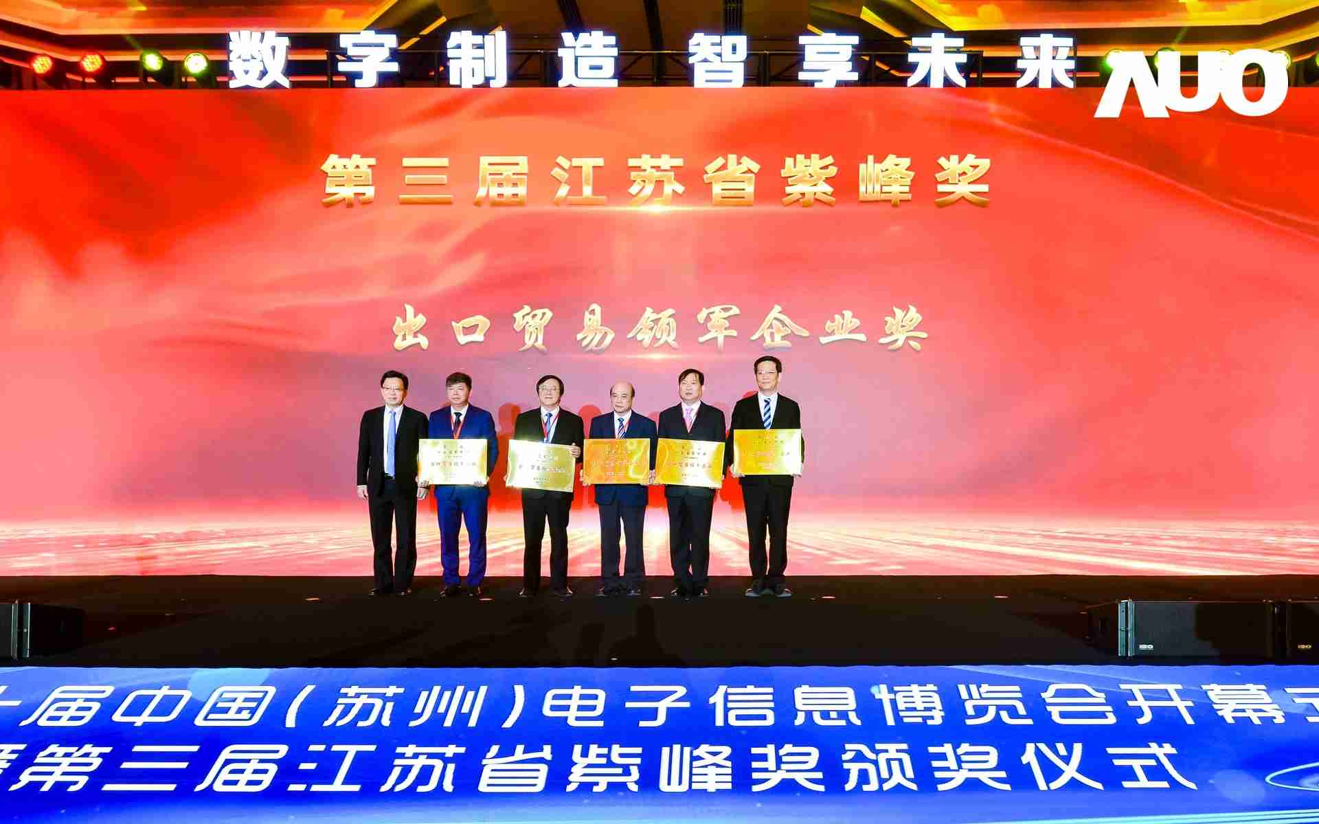 电博会开幕式当天也是第三届江苏省紫峰奖颁奖仪式,,,,省台办、、、工信厅、、商务厅、、、、苏州市相关领导均出席并颁奖。。。。该奖项为表彰对江苏高质量发展做出积极贡献的在苏企业,,,由江苏省政府专门设立。。。。牛牛游戏光电 (苏州) 总经理郭振明代表上台领奖,,,,这也是牛牛游戏苏州连续三次蝉联紫峰奖 出口贸易领军企业奖。。。牛牛游戏数位总经理赵丽娜女士,,,也参与本次开幕式,,,上台为本地化赋能签署战略合作协议,,将优质服务资源集合、、、下沉到更多细分行业,,为更多地区的制造企业提供数字化转型服务。。