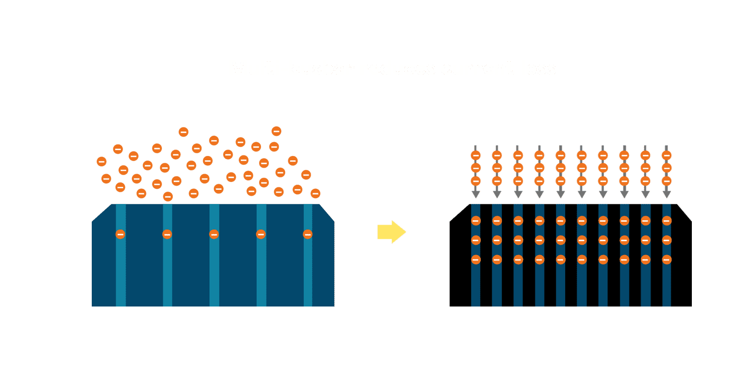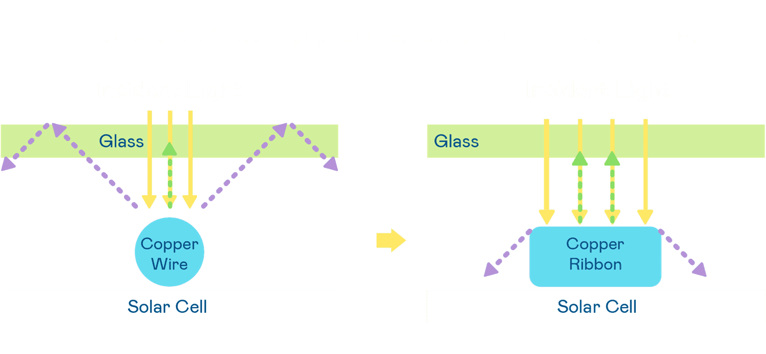 • 电池使用多条铜导线 (Copper wire) 于电池片上形成较短的电流路径,,提高电流收集效率,,,,采用圆形设计的铜导线较传统扁平式的铜焊带 (Ribbon),,,,可增加入射至电池的光线量。。