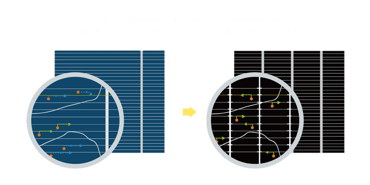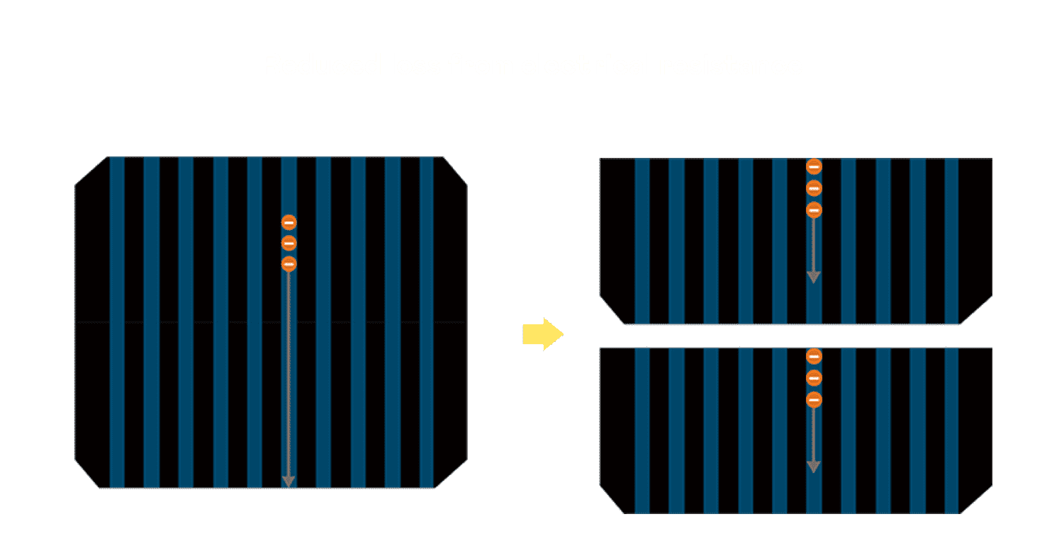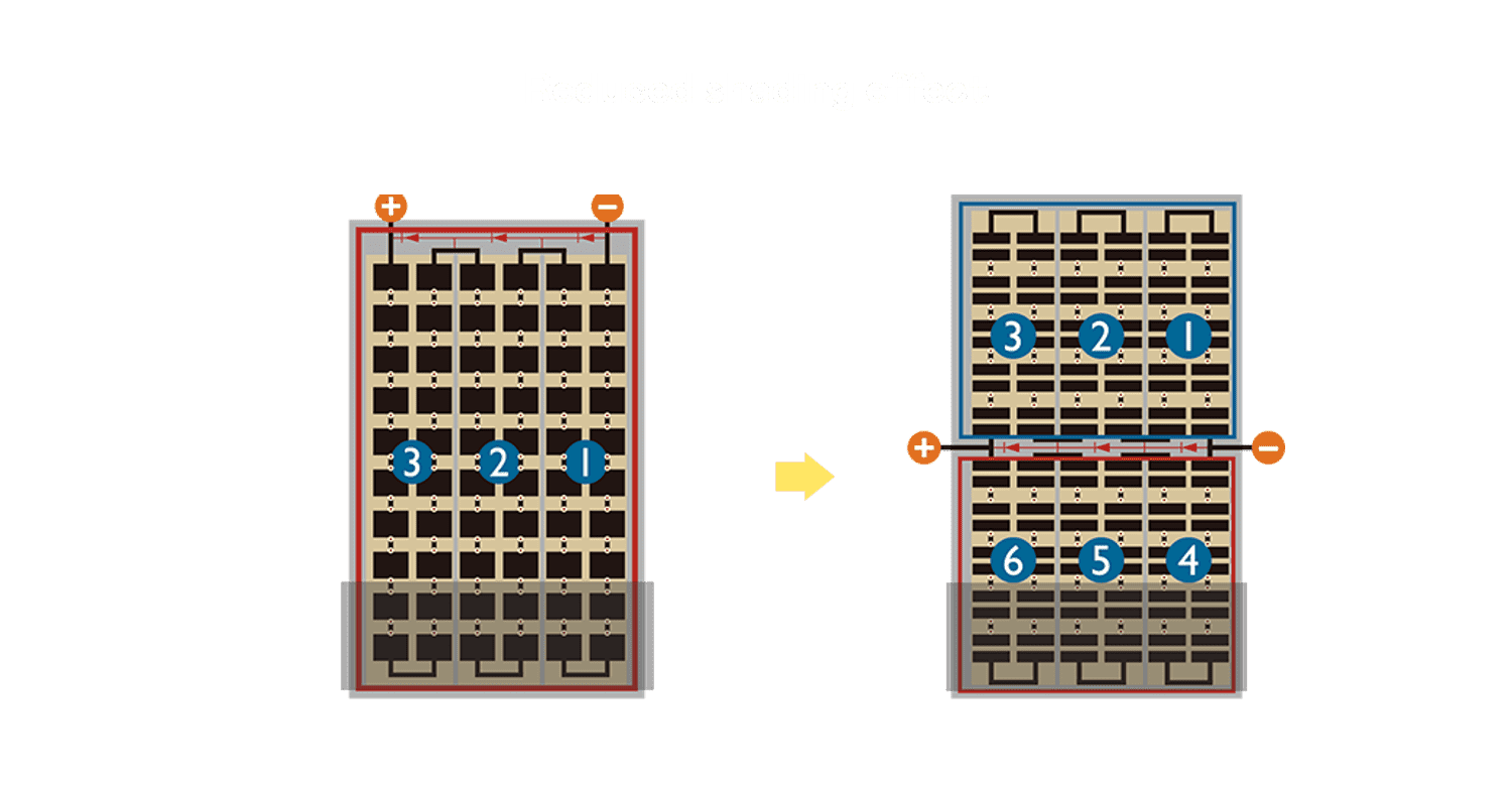 • 结合半切电池,,降低遮阴影响、、提升模组抗隐裂能力、、并减少电阻损耗,,,,进一步提升模组发电效能。。。
